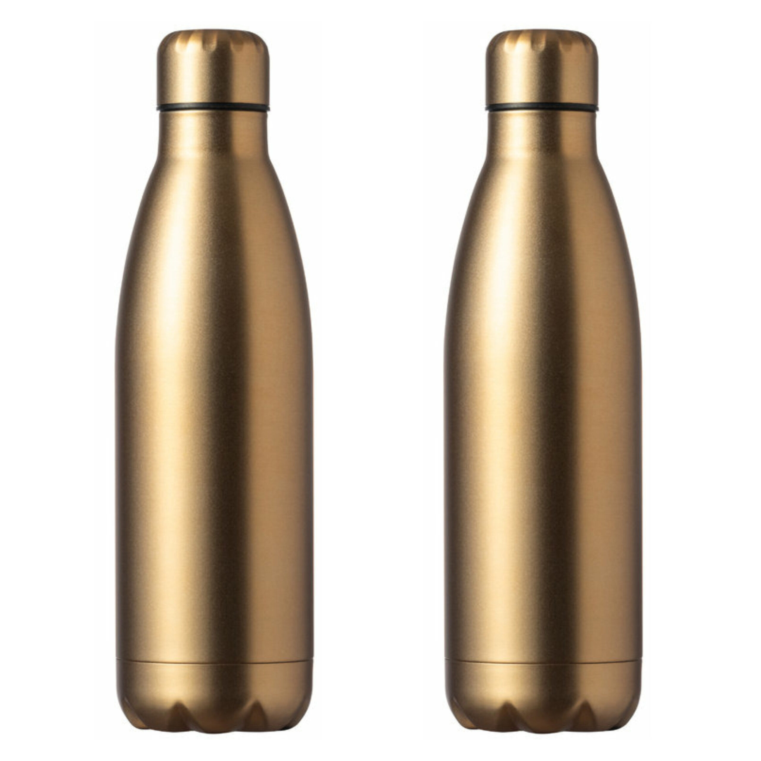 2x RVS waterfles/drinkfles in de kleur mat goud met veiligheid schroefdop en inhoud 790 ml. Afmeting: ca. D7,5 x H26 cm. Inhoud: ca. 790 ml, 79 cl. Gewicht: ca. 175 gram. Materiaal fles: RVS. Geschikt voor magnetron: nee. Geschikt voor vaatwasser: nee. Geschikt voor vriezer: nee. Wordt geleverd in een kartonnen doosje.