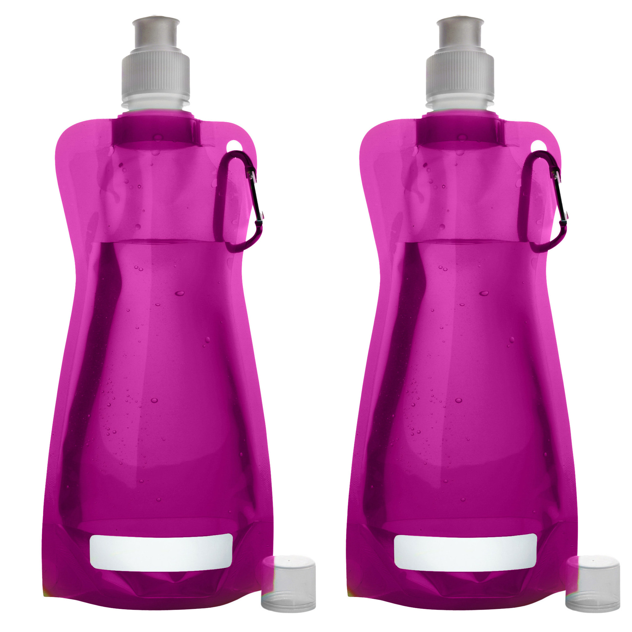 2x waterfles of drinkfles opvouwbaar en lekdicht in het fuchsia roze. Met schroefdop/kliksluiting en een handige karabijnhaak. Afmeting: ca. 26,5 x 11,9 x 3,1 cm. Inhoud: ca. 420 ml. Materiaal: PP kunststof. Gewicht: 24 gram. Deze handige opvouwbare en ruimtebesparende waterfles is ideaal voor elke situatie zoals op het strand, een lange wandeling of op een festival.
