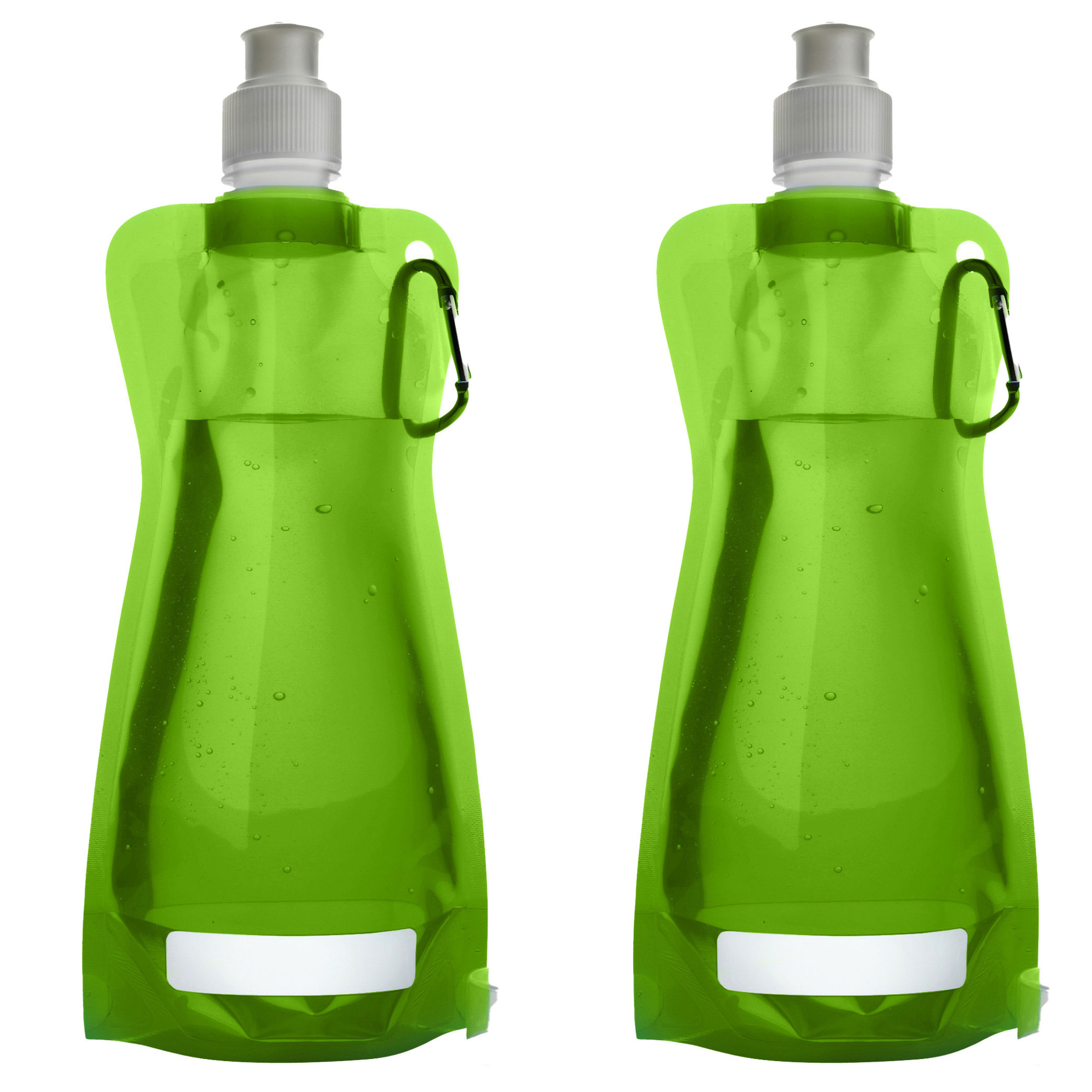 2x waterfles of drinkfles opvouwbaar en lekdicht in het lichtgroen. Met schroefdop/kliksluiting en een handige karabijnhaak. Afmeting: ca. 26,5 x 11,9 x 3,1 cm. Inhoud: ca. 420 ml. Materiaal: PP kunststof. Gewicht: 24 gram. Deze handige opvouwbare en ruimtebesparende waterfles is ideaal voor elke situatie zoals op het strand, een lange wandeling of op een festival.
