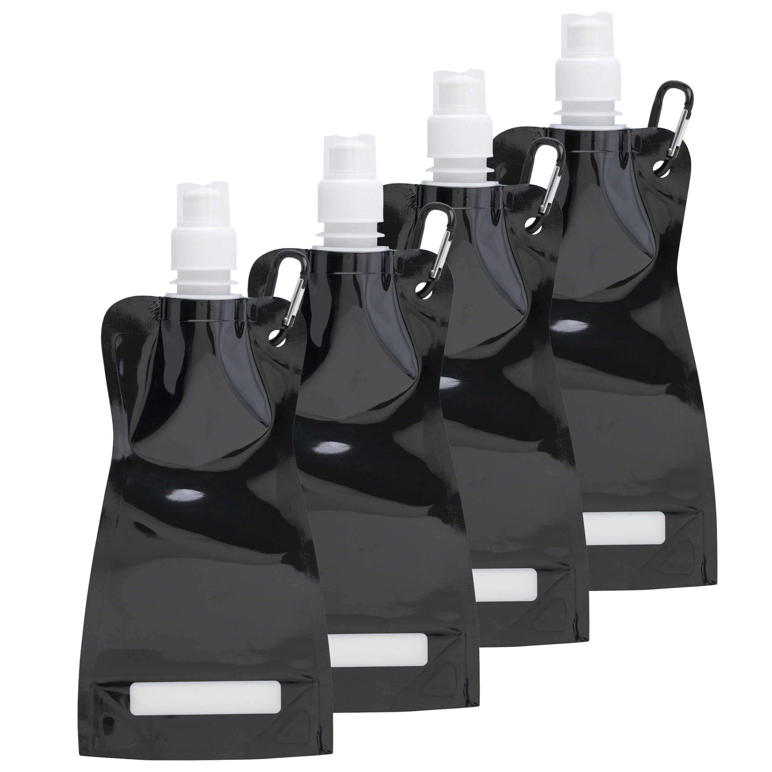 4x waterfles of drinkfles opvouwbaar en lekdicht in het zwart. Met schroefdop/kliksluiting en een handige karabijnhaak. Afmeting: ca. 26,5 x 11,9 x 3,1 cm. Inhoud: ca. 420 ml. Materiaal: PP kunststof. Gewicht: 24 gram. Deze handige opvouwbare en ruimtebesparende waterfles is ideaal voor elke situatie zoals op het strand, een lange wandeling of op een festival.