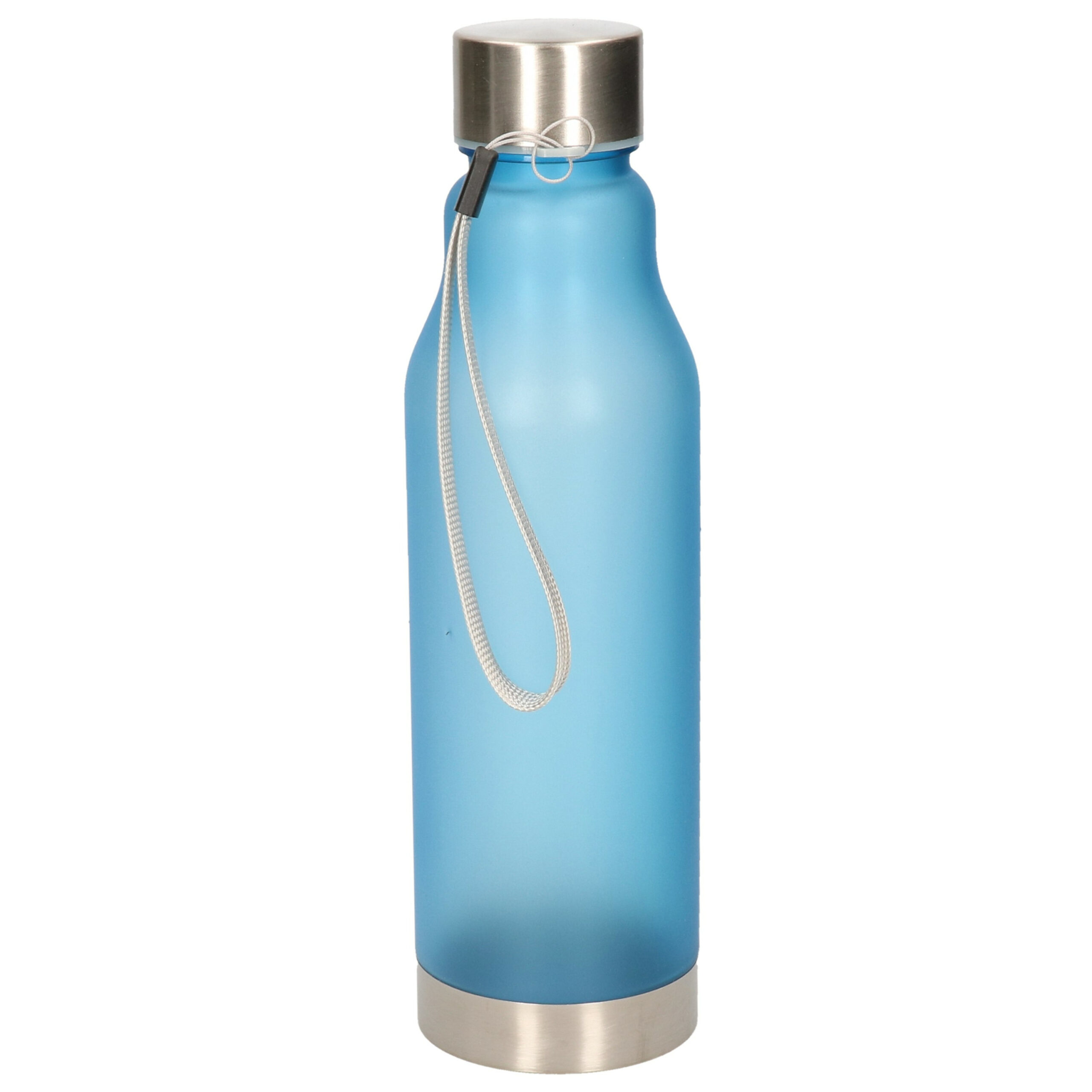 Kunststof waterfles/drinkfles/sportfles/bidon in de kleur blauw transparant met rvs schroefdop. Met draagriem. Afmeting: ca. D7 x H23 cm. Inhoud: ca. 600 ml. Gewicht: ca. 95 gram. Materiaal fles: kunststof. BPA-vrij: ja. Geschikt voor magnetron: nee. Geschikt voor vaatwasser: nee. Geschikt voor vriezer: nee. Sport bidon flessen voor kinderen en volwassenen.