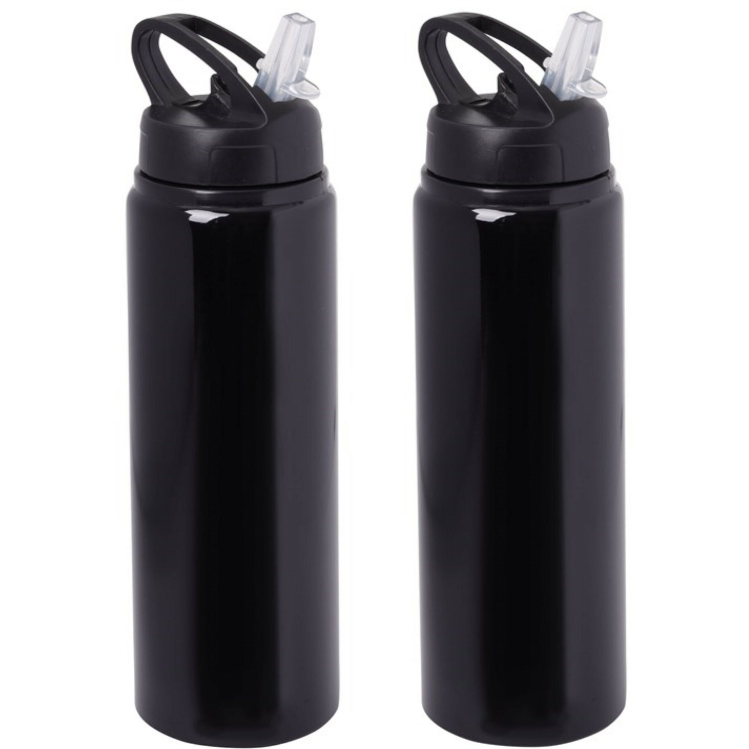 2x kunststof waterfles/drinkfles/sportfles/bidon Sporty in de kleur metallic zwart. Met handvat en uitklapbare drinktuit. Afneembaar rietje in de deksel. Afmeting: ca. D7.5 x H23.5 cm. Inhoud: ca. 800 ml. Gewicht: ca. 125 gram. Materiaal fles: aluminium/kunststof. Sport bidon flessen voor kinderen en volwassenen.