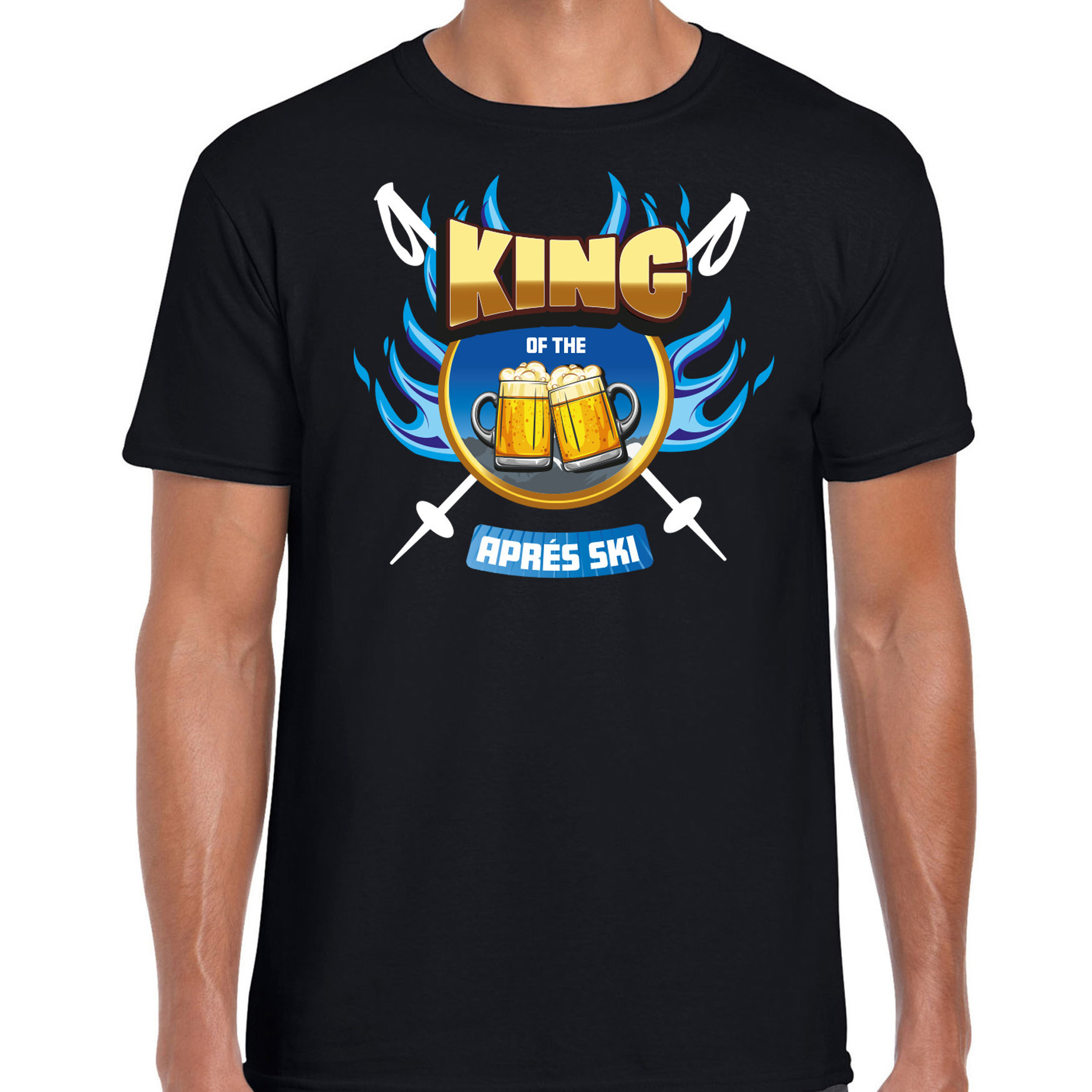 Fout wintersport verkleed t-shirt voor heren in de kleur zwart. Dit leuke shirt is bedrukt met de tekst: KING of the Apres Ski en de afbeelding van twee bierpullen. Trek dit shirt aan op je volgende winter sport vakantie als jij altijd in de Apres Skihut te vinden bent met een biertje! Dit foute shirt is ook grappig om cadeau te geven aan iemand die jij een echte apresski koning vindt.