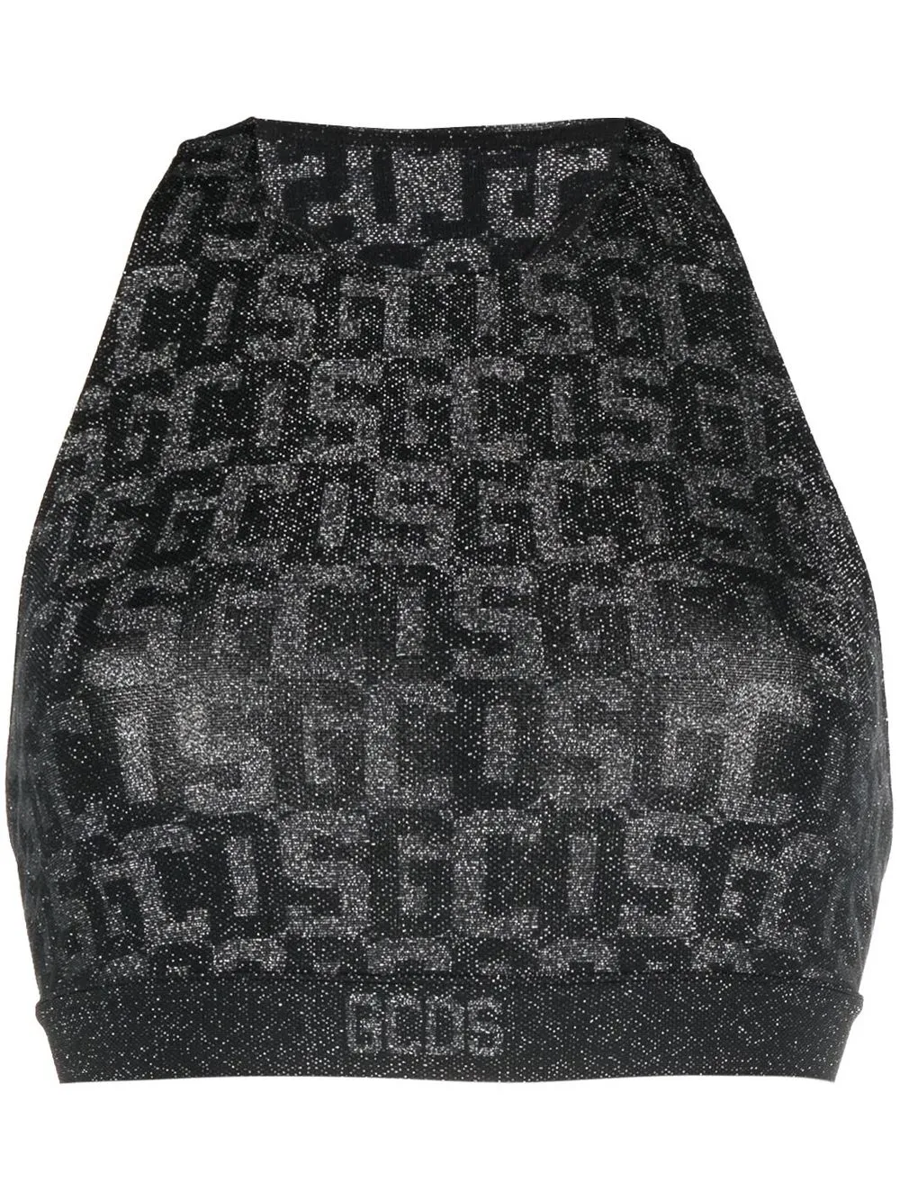 Noir, détail pailleté, motif monogrammé, coupe slim, coupe courte, encolure ronde, design sans manches, dos nageur.
