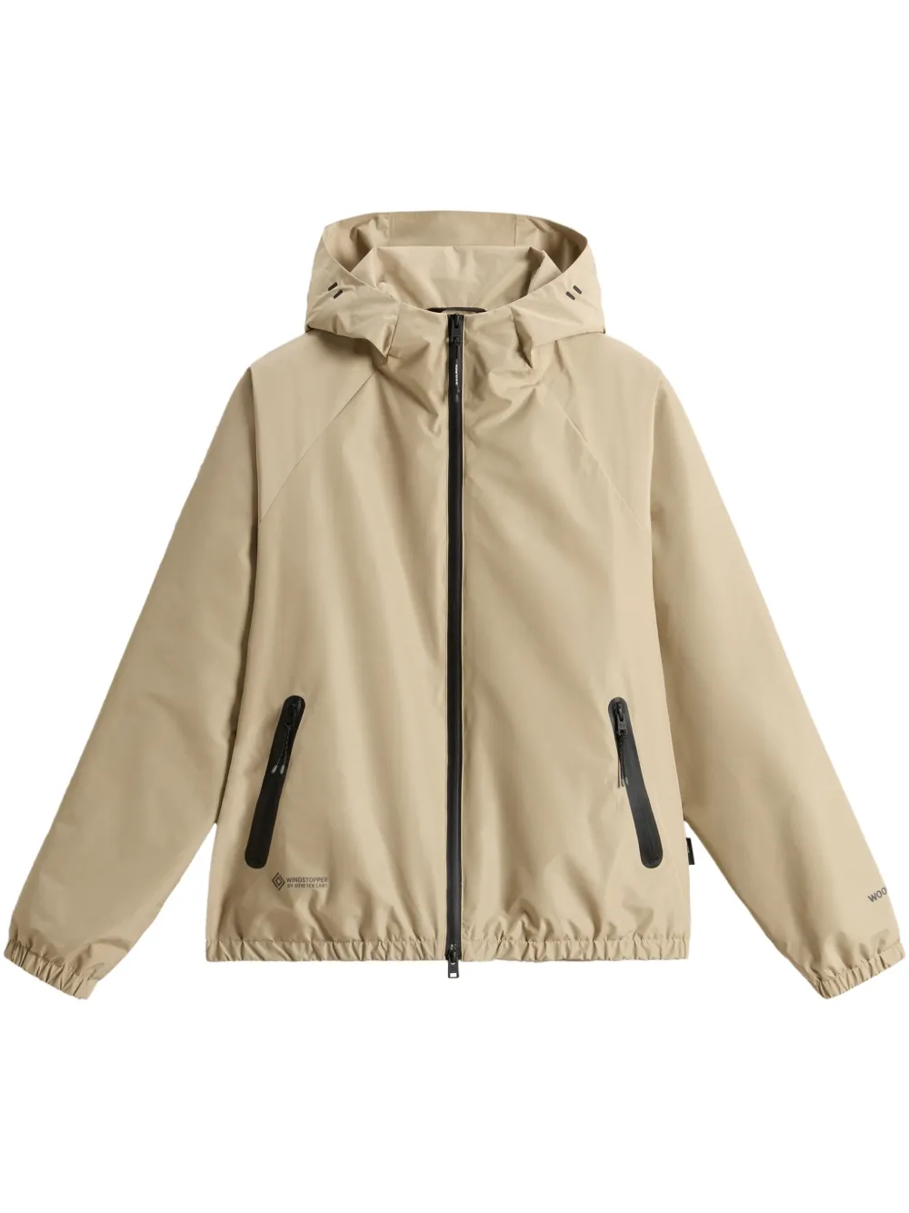 beige sable fermeture zippée à double sens sur le devant capuche à lien de resserrage deux poches zippées ourlet élastiqué