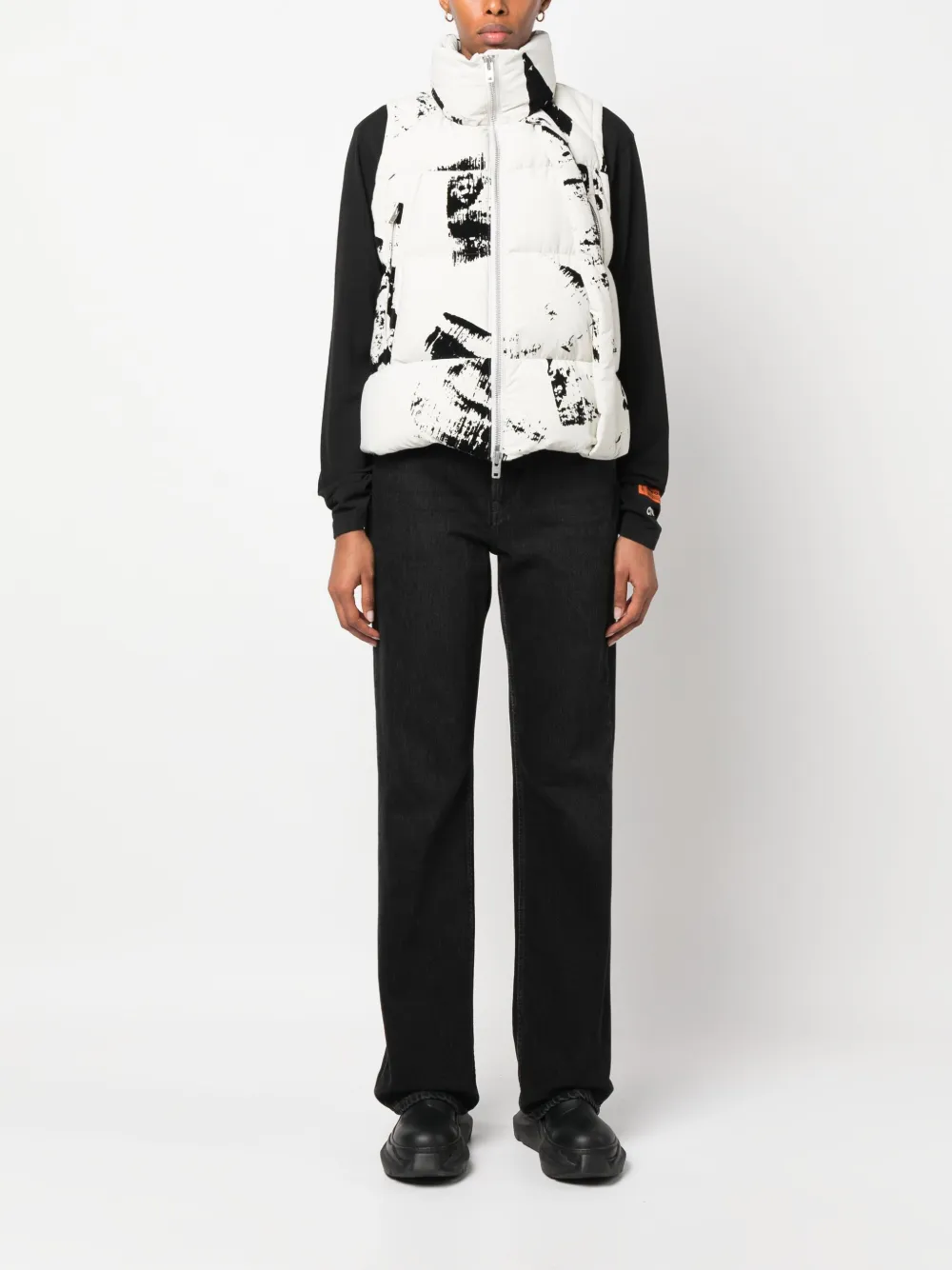 wit/zwart gerecycled polyamide eendendons verfspetter detail gewatteerd design trechterhals banddetail ritssluiting aan de voorkant mouwloos twee zijzakken met ritssluiting rechte zoom