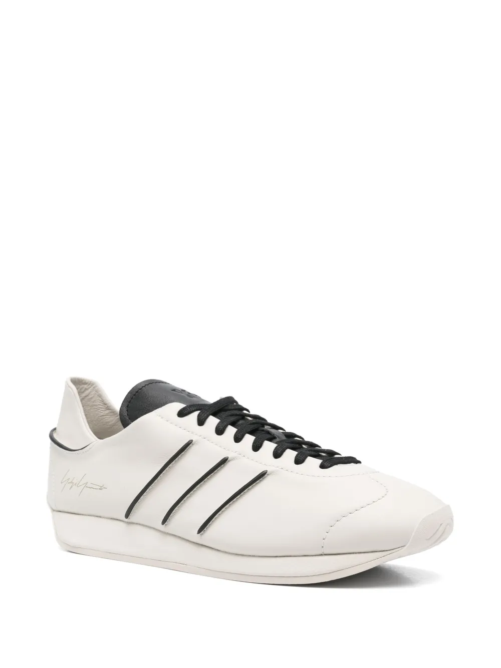 lichtbeige veters aan voorkant platte rubberen zool ronde neus logo-reliëf op de tong