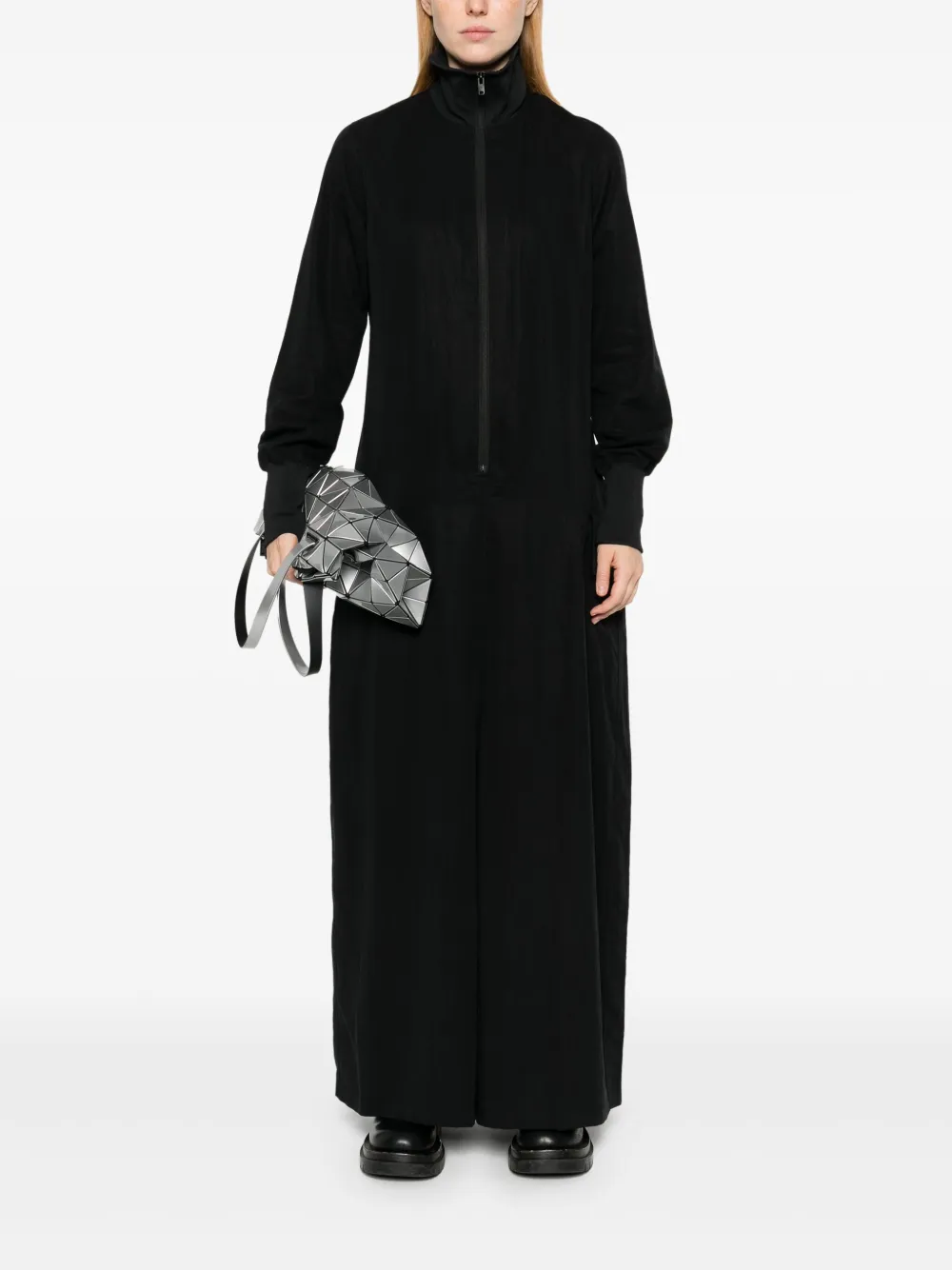 zwart lyocellblend twill weving geribbelde hoge hals lange mouwen geribbelde manchetten twee steekzakken met klepdetail aan de zijkant logoprint aan de zijkant verlaagd kruis volledige lengte wijde pijpen ritssluiting aan de voorkant