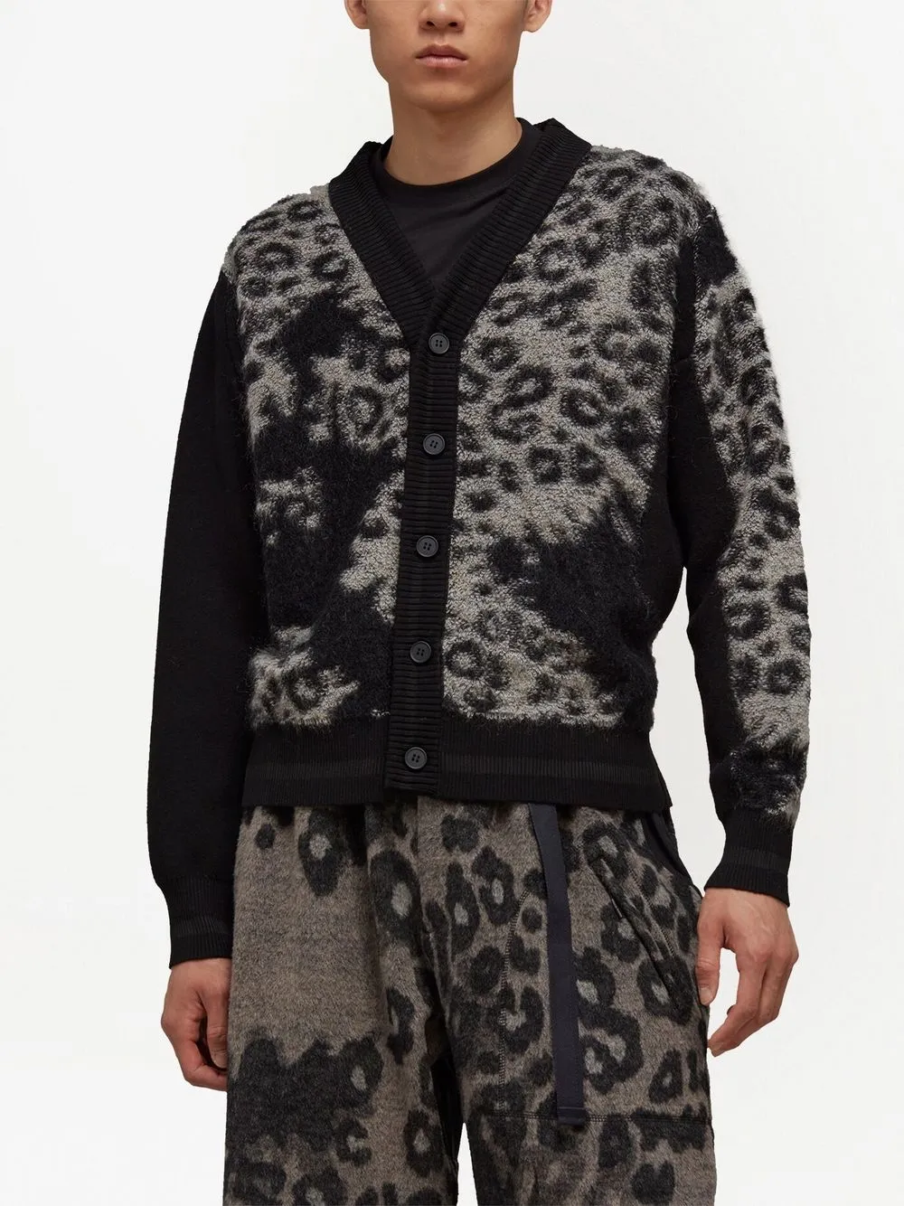 Lichtgrijs, gebreid materiaal, all-over luipaardprint, V-hals, knoopsluiting aan de voorkant, lange mouwen en rechte zoom.