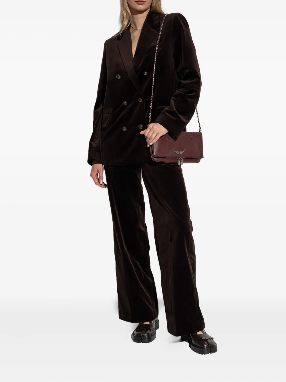 Donkerbruin dubbele rij knopen gekartelde revers voorklepvakken gewatteerde schouders knoopdetail