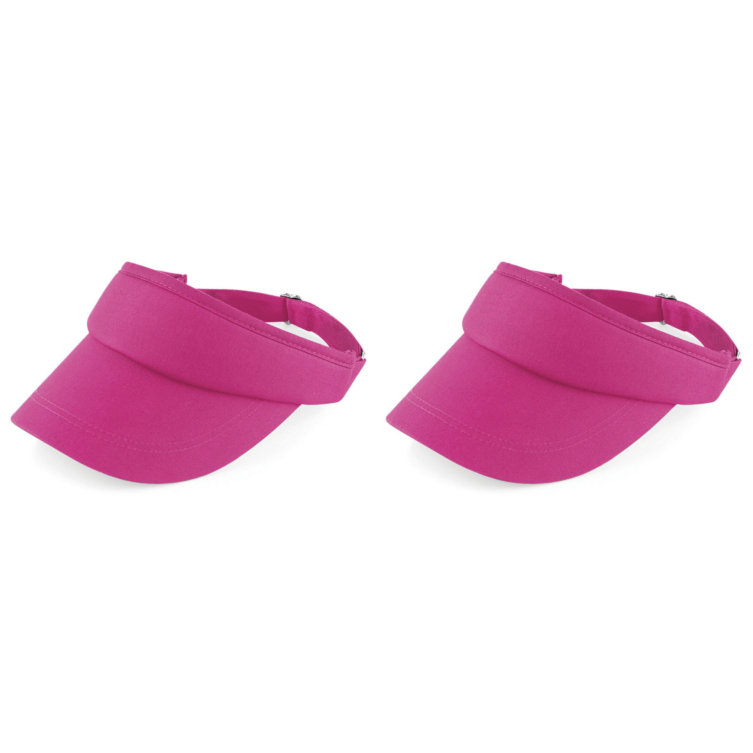 2 stuks sportieve zonneklep petje in de kleur fuchsia roze voor volwassenen. Deze zonneklep heeft een naadloos voorpaneel en een gebogen klep en is 2 draads gestikt. De hoofdmaat is aan de achterzijde verstelbaar.
