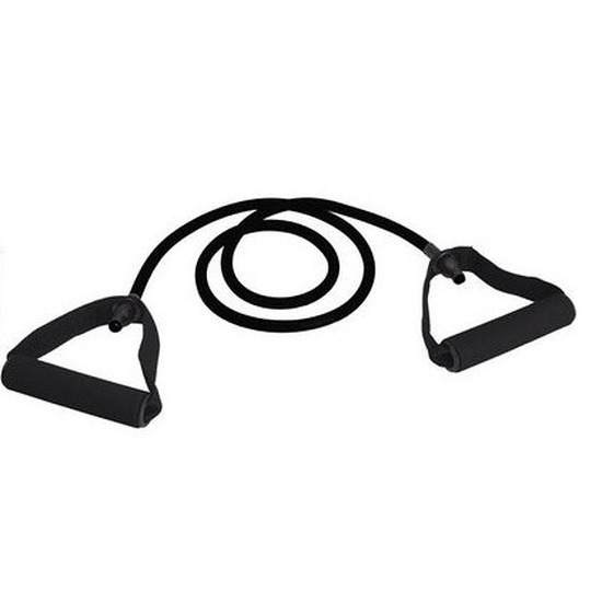 Zwart sportelastiek/weerstandsband fitnessartikelen. Met dit elastiek kun je heel veel verschillende oefeningen doen. Je kunt je handen of voeten in de lussen doen en hier veel verschillende spiergroepen mee trainen. Je lichaam in vorm/shape brengen door te trainen vanuit huis met je eigen sportattributen. Deze elastiek heeft een zware weerstand. Wij hebben ook elastieken met minder weerstand in ons assortiment.