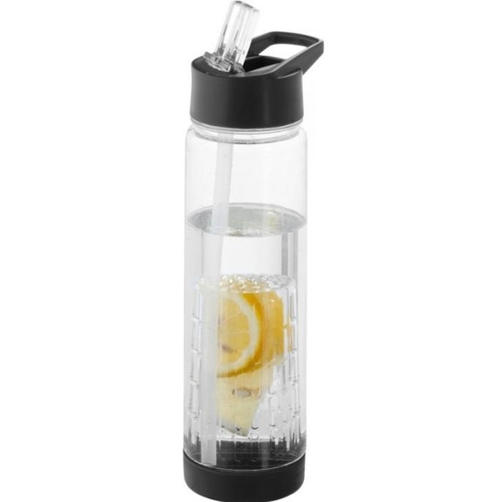 Transparante drinkfles/waterfles met zwarte deksel/bodem en drinktuit 740 ml. Inclusief opschroefbaar fruitfilter om smaak toe te voegen. De bodem kan worden los geschroefd om het filter schoon te maken. Gemaakt van stevig vlek- en geur afwerend bpa-vrij materiaal. Inhoud: 740 ml. Formaat ca: 26 x 7 cm. Materiaal: BPA-vrij kunststof. Drinkflessen/waterflessen voor onderweg.