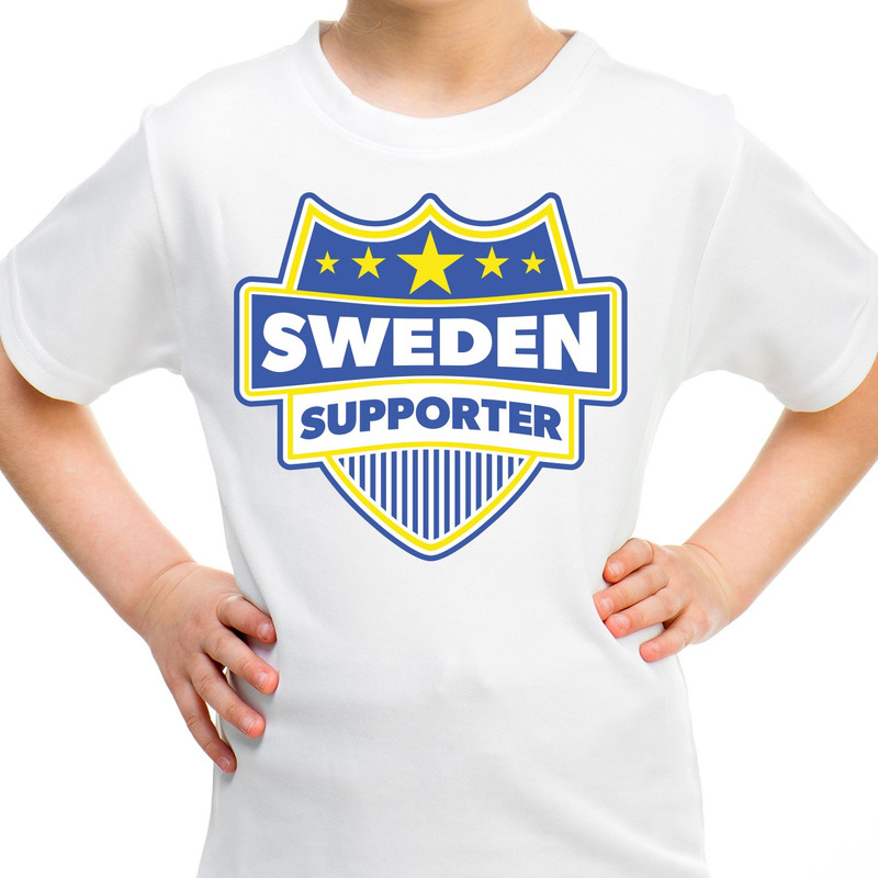 Zweden / Sweden schild supporter t-shirt wit voor kinderen. Op dit witte shirt staat een schild met de tekst: Sweden supporter. Het schild heeft de kleuren van de Zweedse vlag!