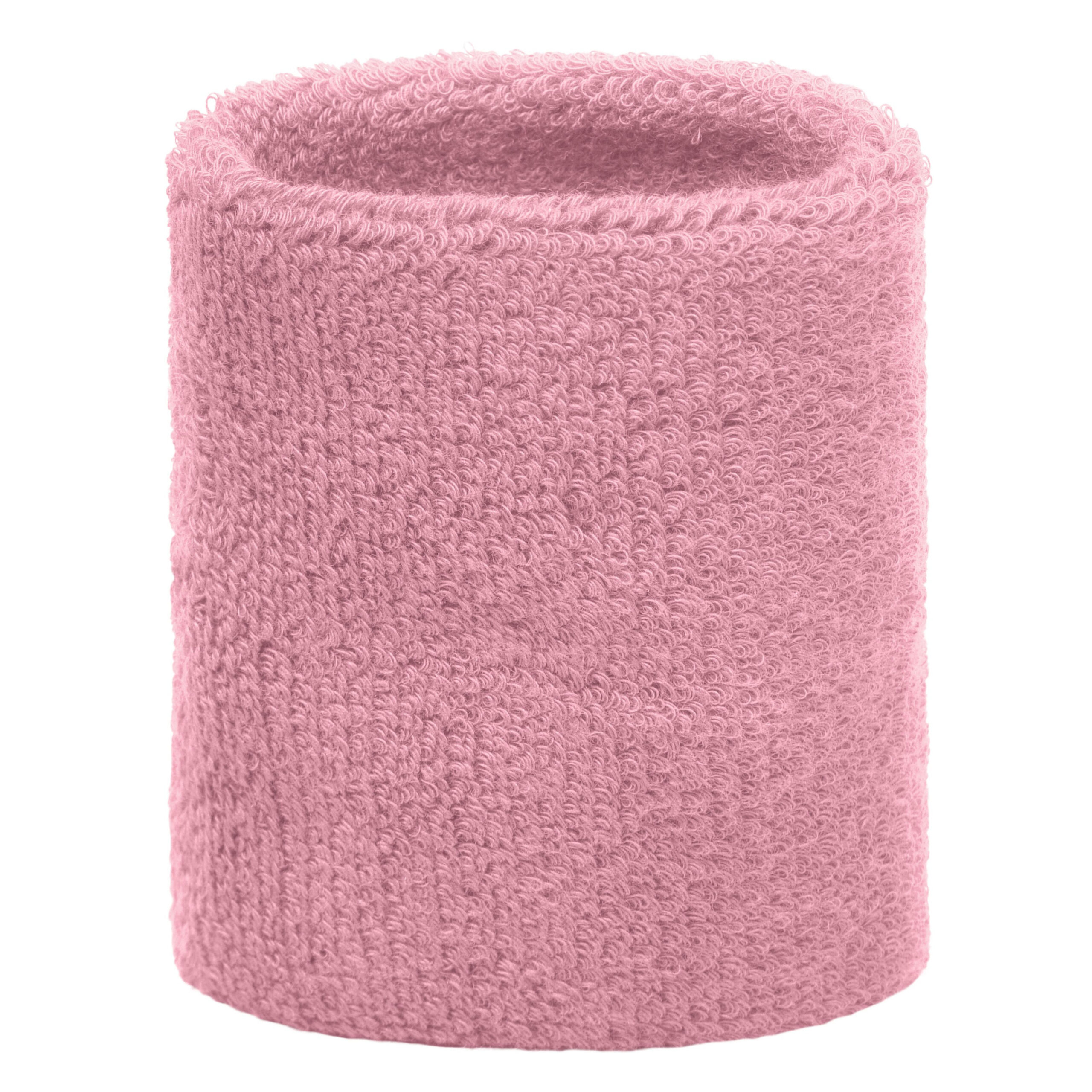 Lichtroze zweetbandje voor pols. De zweetbandjes zijn 8 cm breed. Materiaal: 80% katoen en 20% elasthan. Gekleurde zweetbandjes voor een sportdag of evenement. Verkoop is per stuk!