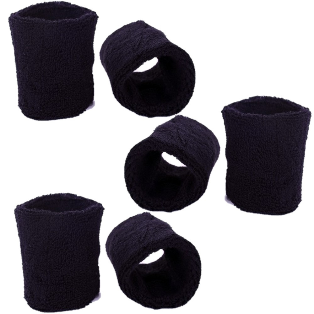 Pols zweetbandjes zwart sport accessoire 6x stuks voor volwassenen. Set zwarte polsbandjes van badstof. Deze zweetbandjes voor om de pols zijn ideaal voor een sportdag of evenement.